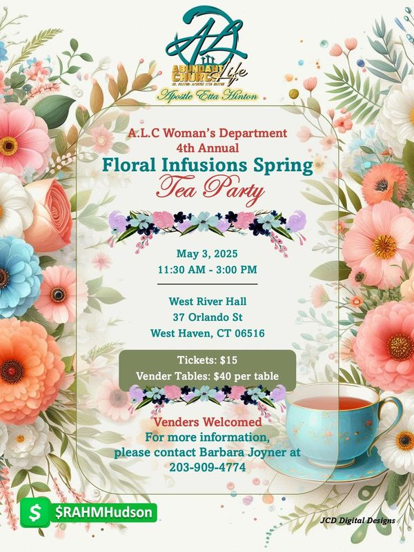 The Woman's Department presents our "4th Annual Floral Infusions Spring Tea Party". This year's event will be held on May 3, 2025, from 11:30 AM - 3:00 PM at the West River Hall on 37 Orlando Street, West Haven, CT 06516.